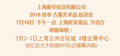 上海新華2016春季古董藝術(shù)品拍賣以面向大眾,面向民間收藏為主旨。 以全新的拍賣方式,現(xiàn)場舉牌, 電話及網(wǎng)絡(luò)委托, App同步競價(jià)為廣大藏友服務(wù)。