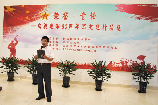 2017年8月18日,由斜土路街道辦事處主辦、云洲古玩城承辦的“榮譽(yù)·責(zé)任”——慶祝建軍90周年軍史題材展覽啟動(dòng)儀式在云洲八樓會(huì)展中心舉行。斜土街道辦事處武裝部長(zhǎng)李育民,新徐匯(集團(tuán))有限公司副總經(jīng)理蔡薏,展品提供人、上海市百名收藏家郭乃興等領(lǐng)導(dǎo)和嘉賓出席了啟動(dòng)儀式。斜土街道社區(qū)干部、斜土街道共建部隊(duì)官兵、幾十名優(yōu)撫對(duì)象和斜土社區(qū)居民及藏友參加了啟動(dòng)儀式,滬上媒體對(duì)展覽進(jìn)行了專(zhuān)門(mén)報(bào)道。