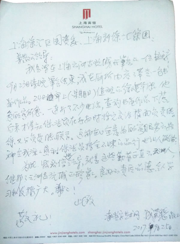 9月23日,第22屆“海上畫壇·情系徐匯”畫展暨筆會正如火如荼地在云洲八樓會展中心展開。參加畫展的一位書畫家在當(dāng)天展會結(jié)束后將一卷書畫作品遺忘在云洲的洗手間內(nèi)。第二天,市場部經(jīng)理徐建華同志得知該情況后,立即詢問會展中心工作人員及各樓面現(xiàn)場管理員。原來保潔員在打掃時發(fā)現(xiàn)了這卷書畫作品,當(dāng)即交至樓面管理人員處,書畫作品很快完璧歸趙。