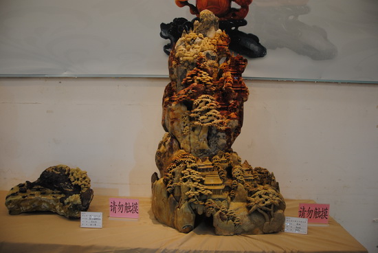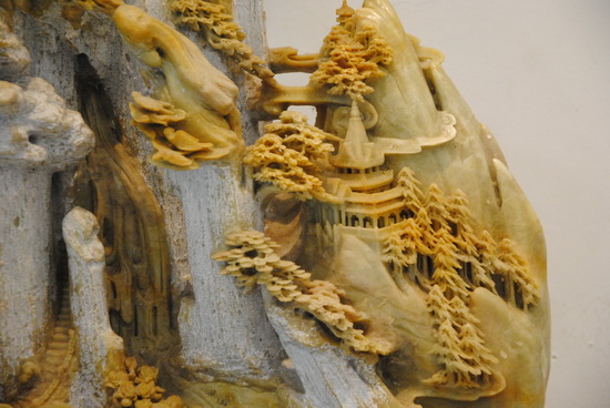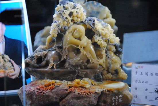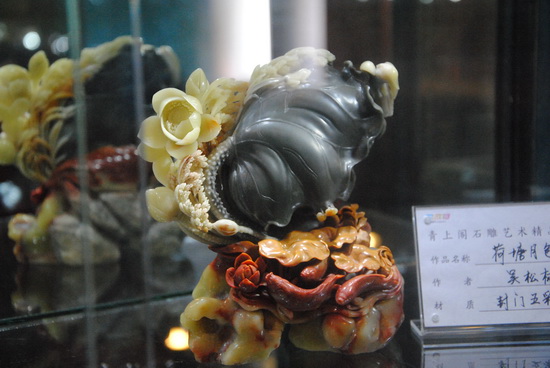 主辦方青上閣以匠人特有的刻苦,揣摩青田石本身的色彩和肌理,結(jié)合自己對(duì)生活的理解和大眾的需求,隨形奏刀,既推出了有吉祥寓意的《連年有余》、《龍騰盛世》等傳統(tǒng)佳作,又根據(jù)現(xiàn)代人對(duì)田園生活的向往,推出了《青翠欲滴》、《蛙聲一片》等作品。巨型青田石雕《踏秋》所采用原石體型巨大,約有一米高,雕工精細(xì),緊湊的分布著亭臺(tái)、閣樓、高塔、路橋,以及松林花果,無(wú)一不精致。雖然小亭高不盈寸,但是菱形圍欄,微翹的屋檐,一點(diǎn)都不含糊,顯示出作者卓越的藝術(shù)造詣。