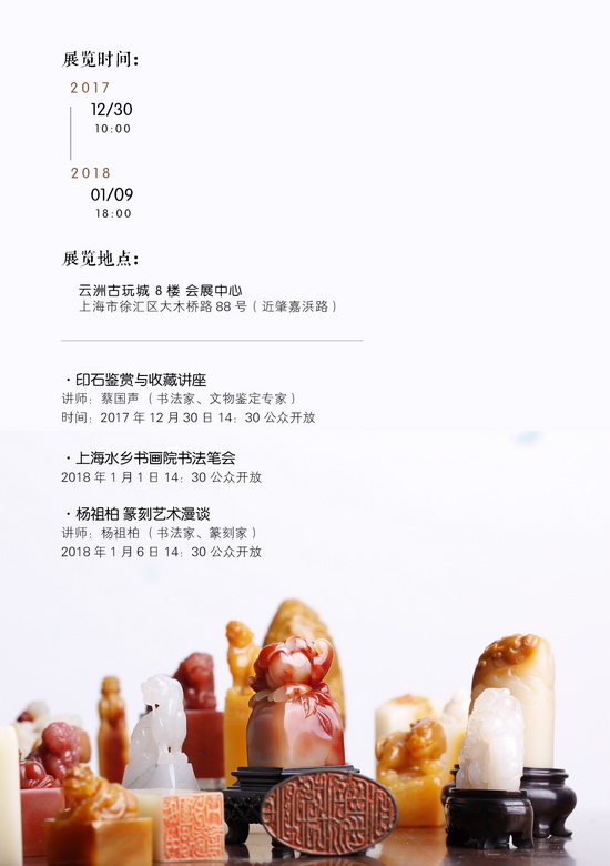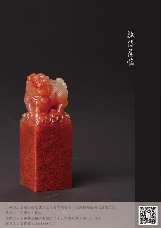 由上海自儒堂藝術(shù)品投資有限公司、福建省壽山石福清聯(lián)誼會主辦,石源堂工作室承辦,上海聯(lián)合拍賣有限公司、云洲古玩城、海上小刀會協(xié)辦的“石之瑰寶——壽山石文化交流會暨海上小刀會篆刻展”將于2017年12月30日至2018年1月9日在云洲古玩城會展中心舉辦。