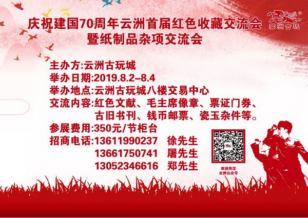 8月2日至4日,云洲古玩城八樓交易中心將匯集全國各地紅色收藏實力展商。與藏友們共同回顧那一段波瀾壯闊的歷史,獻禮建國70周年!如果你也愛紅色收藏,請加入我們!