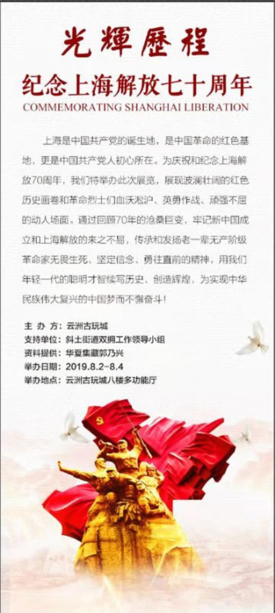 1949年10月1日,毛主席在天安門城樓上向全世界莊嚴(yán)宣告“中華人民共和國中央人民政府今天成立了”,中國已走過風(fēng)雨70年。人曰:人生七十古來稀,然,生命有限,則,國之無限。中國前進(jìn)的道路才剛剛開始。 展期內(nèi),多功能廳將同時舉辦“光輝歷程——紀(jì)念上海解放七十周年”展,通過一張張生動的照片和一件件珍貴的實(shí)物帶你還原曾經(jīng)發(fā)生在上海的腥風(fēng)血雨,見證英雄的人民。