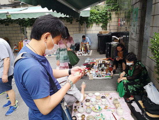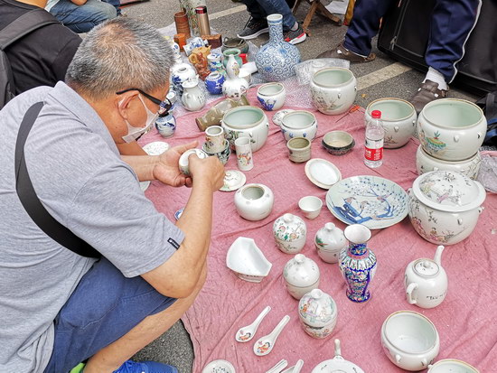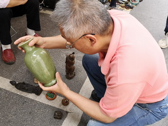 有的買了小香爐,有的買了瓷花瓶,有的買了玉器,還有的瞇著眼、皺著眉在各個攤位間轉(zhuǎn)來轉(zhuǎn)去,拿起藏品仔細查看又放下,這就是傳說中的行家吧。