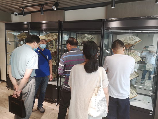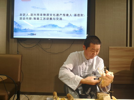 宜興市級(jí)非物質(zhì)文化遺產(chǎn)傳承人湯忠財(cái)講解了折扇的制作工藝