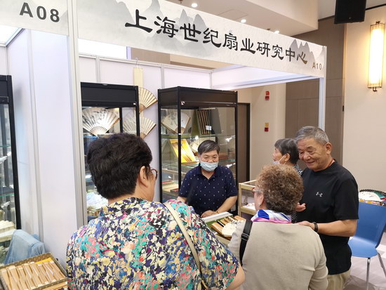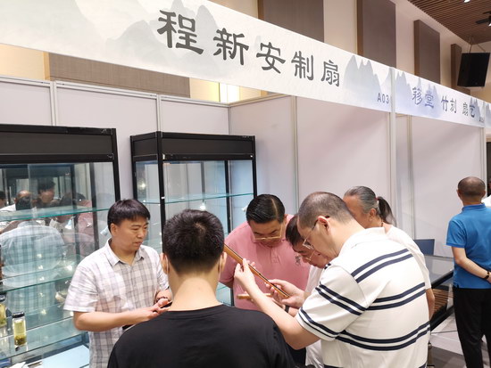 本次扇展是疫情之后云洲舉行的首場(chǎng)展覽,現(xiàn)場(chǎng)人氣爆棚,成交量十分可觀。蘇州美和、程新安制扇等扇廠帶來大量扇骨,種類繁多、品質(zhì)精良,受到很多扇友的青睞。蘇州凌云的宮扇繡工精美,造型驚艷,引發(fā)女粉絲的搶購(gòu)。上海書畫名家、國(guó)家一級(jí)美術(shù)師胡寧海的扇面畫涵蓋山水、花鳥、蟲魚、人物,他還自創(chuàng)燙刻工藝,結(jié)合扇骨上的花紋燙刻圖案,使扇骨和扇面畫相互融合、相得益彰。上海世紀(jì)扇業(yè)的名家成扇,更是有一群忠實(shí)擁躉。與扇藝有關(guān)的扇刻更是引人注目。趙偉陽竹雕工作室等展現(xiàn)精彩絕倫的雕刻技藝。