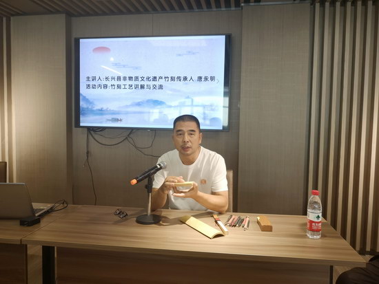 浙江省長(zhǎng)興縣非物質(zhì)文化遺產(chǎn)竹刻傳承人唐永明講解了竹雕工藝