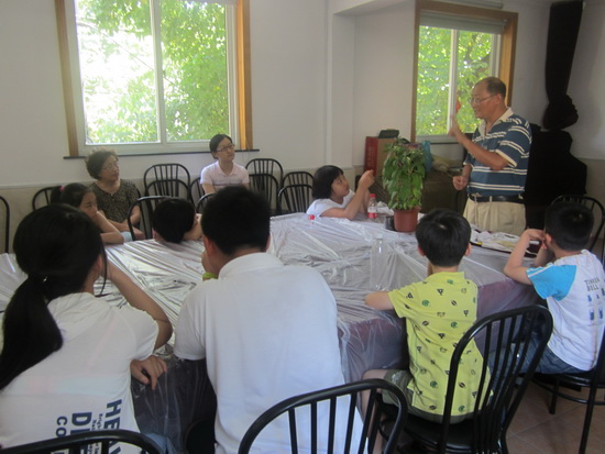 2014年7月21日,在永嘉路580號永嘉新村的居委活動室里,十多位中小學(xué)生共同參與了建岳居委舉辦的“親親大自然——手心中的家庭菜園”活動。云洲商戶黨員裴學(xué)海老師甘當(dāng)志愿者,為同學(xué)們講解栽培小技術(shù)。