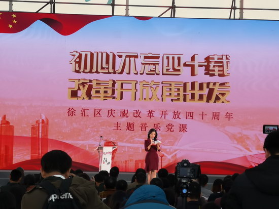 接著,音樂黨課以初心不忘四十載,改革開放再出發(fā)為主題,緊扣改革開放四十年來徐匯區(qū)的變化歷程,以新穎、多樣的形式再現(xiàn)了改革的碩果。黨課選取了最能代表徐匯發(fā)展變化的幾個地標(biāo)和故事并邀請到親歷改革參與者代表作為主講嘉賓;電話連線了安徽鳳陽小崗村大包干帶頭人嚴(yán)淦昌講述并聆聽了小崗村40年來變遷的故事。黨課還通過歌曲演唱、詩歌朗誦、打擊樂器表演等多種藝術(shù)形式的有機(jī)結(jié)合,積極探索新時代教育的全新方式。