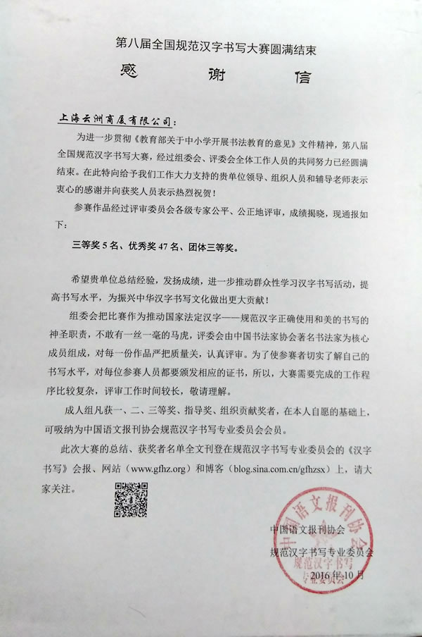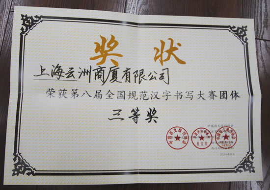 云洲商廈榮獲第八屆全國(guó)規(guī)范漢字書寫大賽團(tuán)體三等獎(jiǎng),個(gè)人三等獎(jiǎng)5名,優(yōu)秀獎(jiǎng)47名。進(jìn)一步推動(dòng)公司服務(wù)品質(zhì)和服務(wù)水平的提高,同時(shí)也為振興中華漢字書寫文化做出更大貢獻(xiàn)。