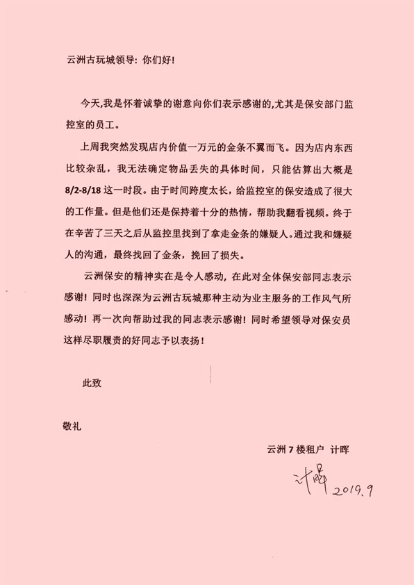 9月9日,云洲商廈辦公室收到一封來自商戶的感謝信。信中說他上周發(fā)現(xiàn)店內(nèi)價值一萬元的藏品不翼而飛,但無法確定丟失時間,只能估算出大概的8月2日至18日的時間段。由于時間跨度長,視頻調(diào)閱工作量大,耗費(fèi)了三天才從視頻中找到拿走藏品的人,最終通過溝通,他拿回了藏品,挽回了損失。商戶被云洲全心全意為商戶服務(wù)的精神所感動,特來信表示感謝。