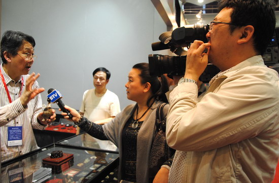 珠寶、玉器也是本次展會(huì)大熱。泰國(guó)裕泰珠寶行前姑娘們駐足觀看,不忍挪步。他家有世界上最好的藍(lán)寶石——克什米爾“矢車(chē)菊”:表面藍(lán)色,打光后變色,藍(lán)中帶紫;有唯一一個(gè)有名字的寶石——蓮花(帕德瑪剛玉),它的顏色在粉、橙之間,十分難得;還有1克拉、2克拉、3克拉的鴿血紅,色彩紅艷可人。由于紅寶石存在天然的瑕疵,需要進(jìn)行熱處理才能達(dá)到完美效果,而泰國(guó)的熱處理技術(shù)一流,能使寶石表面更美。其他珠寶店人氣也相當(dāng)旺?,|立珠寶的名貴翡翠在聚光燈下灼灼閃光,像磁石一樣老遠(yuǎn)就能將藏友的目光吸引過(guò)來(lái)。璞德堂的和田籽玉溫潤(rùn)、光滑,雕成猴、龍、鵪鶉等吉祥圖案,適合細(xì)細(xì)把玩。天景行的乾隆時(shí)期黃玉螭龍瓶則由一塊罕見(jiàn)的、較大的玉制作而成,做工精細(xì),龍的動(dòng)態(tài)栩栩如生。還有臻藝軒展出的各色形似瓜果菜肴的石頭也十分有趣。