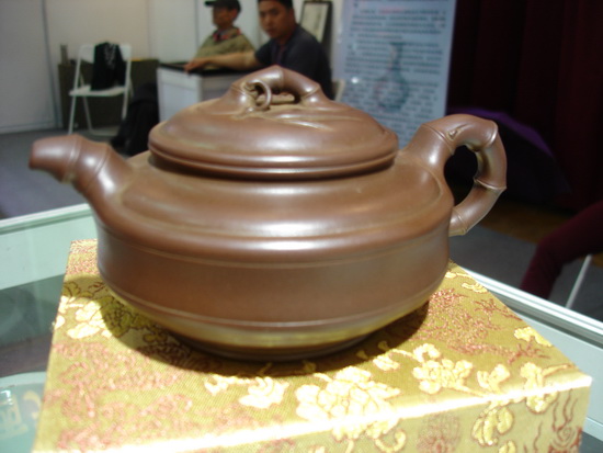 紫砂壺和竹雕的愛(ài)好者也能找到他們喜愛(ài)的去處。江蘇宜興紫砂記工作室展出了周亞春老師制作的各種茶壺。其中,雙線竹鼓壺用上等紫砂泥料支撐,壺身貼竹葉裝飾,竹葉飽滿筆直,手法精致,整體線條流暢,非常美觀,是不可多得的一件珍品。它砂性隱現(xiàn)、透氣好、易泡養(yǎng),壺體端莊質(zhì)樸無(wú)華、質(zhì)地細(xì)膩、手感極佳。趙偉陽(yáng)工作室展出了《天然如意》和《醉八仙》等作品。《天然竹如意》取自天然的毛竹變異材料,竹上結(jié)天然如意造型,作者在竹子上繪仿古云圖,儼然一把天然的竹如意?!蹲戆讼伞啡宋锩娌坑弥袂囝伾憩F(xiàn),繪畫(huà)與淺浮雕結(jié)合在大約一毫米的竹青上,人物神態(tài)細(xì)膩、逼真,整幅圖案立體感強(qiáng),是不可多得的竹雕精品。