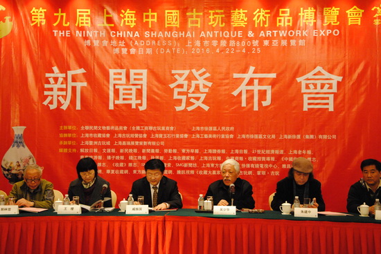 2016年4月6日下午,第九屆上海中國(guó)古玩藝術(shù)品博覽會(huì)新聞發(fā)布會(huì)在華亭賓館舉行。本屆古博會(huì)將于4月22日至25日在東亞展覽館舉行。古博會(huì)由全聯(lián)民間文物藝術(shù)品商會(huì)(全國(guó)工商聯(lián)古玩業(yè)商會(huì))、上海市徐匯區(qū)人民政府主辦,上海市收藏協(xié)會(huì)、上海古玩經(jīng)營(yíng)協(xié)會(huì)、上海寶玉石行業(yè)協(xié)會(huì)、上海工藝美術(shù)行業(yè)協(xié)會(huì)協(xié)辦,上海云洲古玩城、上海嘉瑞展覽策劃有限公司承辦。上海市收藏協(xié)會(huì)會(huì)長(zhǎng)吳少華先生,上海工藝美術(shù)行業(yè)協(xié)會(huì)秘書(shū)長(zhǎng)朱建中先生,上海古玩經(jīng)營(yíng)協(xié)會(huì)秘書(shū)長(zhǎng)徐曉嶺先生,上海寶玉石行業(yè)協(xié)會(huì)副秘書(shū)長(zhǎng)郭林雪先生,徐匯區(qū)文化局文化市場(chǎng)和產(chǎn)業(yè)管理科科長(zhǎng)王纓女士,上海新徐匯(集團(tuán))有限公司黨委書(shū)記、董事長(zhǎng)戚振國(guó)先生,上海云洲古玩城總經(jīng)理吳中澤先生出席了新聞發(fā)布會(huì)并在主席臺(tái)就坐?!督夥湃?qǐng)?bào)》、《文匯報(bào)》、《新民晚報(bào)》、《新聞晨報(bào)》、《勞動(dòng)報(bào)》、《東方早報(bào)》、上海電視臺(tái)、“雅昌藝術(shù)網(wǎng)”、“東方網(wǎng)”、“中華古玩網(wǎng)”、“華夏收藏網(wǎng)”等32家新聞媒體和門(mén)戶網(wǎng)站,工商銀行建國(guó)西路支行、浦發(fā)銀行打浦橋支行、民生銀行麗園路支行代表,以及展商代表等近百人參加了新聞發(fā)布會(huì)。