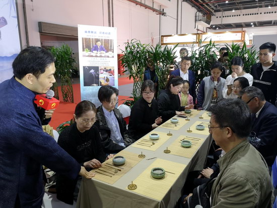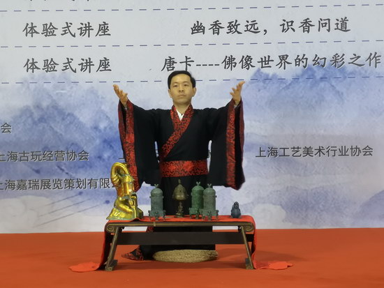 講座區(qū),上午由上海國際收藏品有限公司藝術(shù)品部經(jīng)理、上海市收藏協(xié)會傳習(xí)所聯(lián)盟秘書長、上海市收藏協(xié)會夢云香道傳習(xí)所所長陳振東主講《幽香致遠(yuǎn),識香問道》香道文化。他身穿漢服,在“青青子衿,悠悠我心“的音樂聲中演繹香道的優(yōu)雅和余味悠長的意境,讓藏友們沉浸其中。演繹結(jié)束后,他向藏友介紹香道用具、演示香道步驟、講解香料的成分,并邀請藏友們親自體驗(yàn)香道程序,品味各種香味的不同。不少藏友專程趕來聽講,其中不少是年輕人,這對香道文化的傳承是大有裨益的。