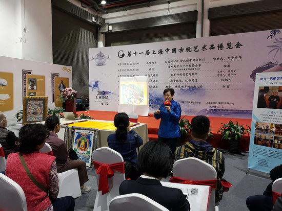 下午,由中國工藝美術(shù)協(xié)會唐卡專業(yè)委員會副秘書長、上海市收藏協(xié)會承棠唐卡傳習(xí)所所長封雷主講《唐卡——佛像世界的幻彩之作》講座。封雷及其助手介紹了唐卡文化的誕生與發(fā)展,唐卡的繪制工藝,唐卡中展現(xiàn)的佛教文化。最后,封雷還展示了他悉心收藏的名家唐卡作品,讓藏友們親眼領(lǐng)略唐卡藝術(shù)的魅力。