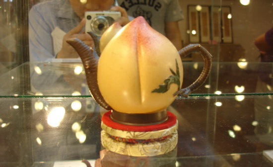 參觀粲雅軒展位,你就會感覺:“精彩根本停不下來!”。展柜里匯聚了各大紫砂名宿的精品:瞿子冶的子冶石瓢壺、汪寅仙的《曲壺》、顧景舟《座有蘭言壺》等,星光熠熠。不少藏友在展品前駐足良久,或與展商探討紫砂壺的歷史或拍照留念,愛壺之心,溢于言表。汪寅仙的曲壺制于1988年。汪大師一生僅做四把,兩把存于博物館,一把被其他實力藏家收藏,第四把就是眼前被粲雅軒收藏的這一把,市場價值已達數(shù)百萬。清代澹然齋加彩潮州式武夷功夫茶壺以其巧妙的葫蘆型子母壺的設(shè)計和艷麗的色彩格外吸引人。它結(jié)合了陶都宜興的最佳胎藝和瓷都景德鎮(zhèn)的最佳釉色,可謂精品中的精品。清早期《朱砂龍蛋壺》砂料較粗,壺把略方,帶有早期工藝的明顯特征,古樸動人。蔣蓉的壽桃壺精致小巧,色彩鮮艷,仿佛一個令人垂涎欲滴的鮮嫩壽桃。它不設(shè)壺蓋,由底部入水,細(xì)長的壺嘴出水的設(shè)計,也別具一番情趣。
