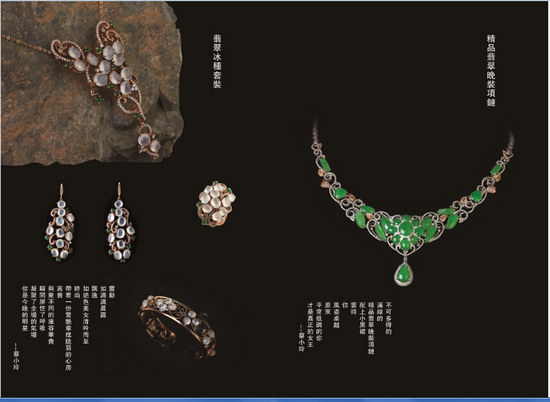 本屆珍藏展還將推出一批具有濃郁文化氣息的對(duì)牌?!包S翡三件套”選用整塊冰糯種翡翠雕成三件黃翡俏雕掛件。這套寓意“合家幸?!钡膶?duì)牌分別以“荷葉蓮蓮、金盤(pán)滾珠”,“鳥(niǎo)立枝頭、金蓮怒放”,“觀音逐波、步步蓮華”為主題,設(shè)計(jì)巧妙,意境深遠(yuǎn),三件為組的套牌在滿足家庭佩的同時(shí),也給想購(gòu)買(mǎi)一件飾品的消費(fèi)者提供了選擇的余地。另有紅藍(lán)寶石、沙弗萊、南紅、綠松石,琥珀,紫檀,花梨,檀香等制品也頗值得選購(gòu)。