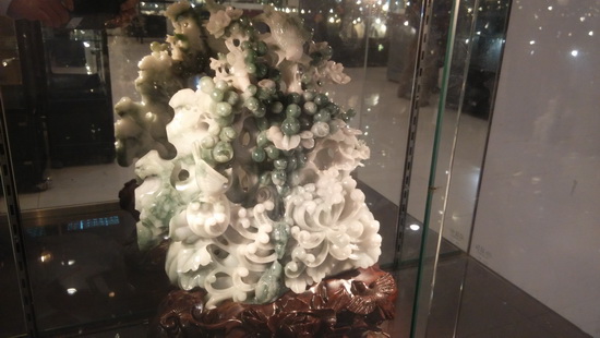 此次展出的翡翠作品涵蓋翡翠吊墜、方牌、戒指、手鐲、把件、擺件、晚裝鏈套裝等。上乘的翡翠材質(zhì)令參觀者們大開(kāi)眼界。帝王綠翡翠, 罕見(jiàn)的春帶彩翡翠, 顏色均勻、質(zhì)地細(xì)膩的黃翡等令人嘖嘖贊嘆。充滿創(chuàng)意的設(shè)計(jì)也是翡翠展的一大亮點(diǎn):剔透晶瑩的滿綠翡翠18K金和鉆巧妙的連接在一起,形成一個(gè)豎著小耳朵、系著小領(lǐng)結(jié)的可愛(ài)貓咪,令時(shí)尚美女們愛(ài)不釋手。