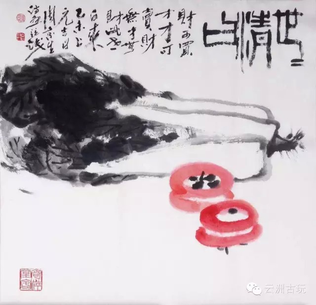 周京生難得一見(jiàn)的果蔬圖創(chuàng)作,在水墨內(nèi)涵與形色表現(xiàn)上均很成功。橫臥的白菜與豎置的紅柿,在視覺(jué)上有一種空間的立體呈現(xiàn),在諧音上是“事世清白”的寓意傳達(dá)。畫者心境的淡泊與坦蕩,加深了畫面質(zhì)感的通透,寥寥數(shù)筆就將果蔬形神捕盡。白菜葉濃樁淡,有筆有墨,靜態(tài)文氣。柿子兩筆圈成,一個(gè)頂朝上,一個(gè)頂朝下,活色生香。