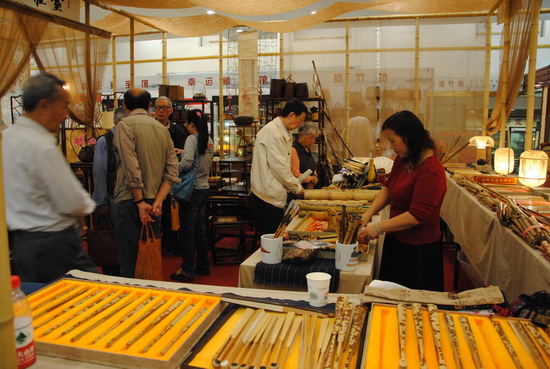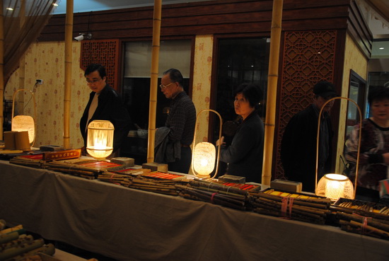安吉岳龍扇廠帶來(lái)的毛竹皮制作的折扇和屏風(fēng)令人耳目一新。以竹皮的紋理和質(zhì)感,制成建筑、花鳥、山水的圖案,給人別具一格的感覺。另外,聽竹廬帶來(lái)的提梁燈在造型結(jié)構(gòu)、比例、工序、編織等方面完美保留了傳統(tǒng)器物的美,又通過(guò)再設(shè)計(jì),創(chuàng)造出不同凡響的意蘊(yùn)美,博得不少藏友的喜愛。